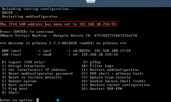 Go to the following page, select 2, configure the IP address of the LAN port, and set the IP address, subnet mask, and gateway as prompted.