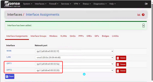 • Click assingments add ports, Add OPT1 (igc0)and OPT2( igc1).