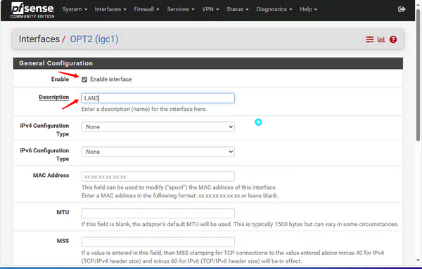 • Click OPT1 Enable interface,Description is changed to LAN3.