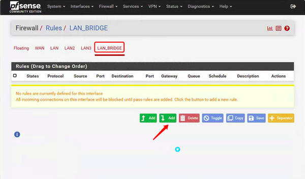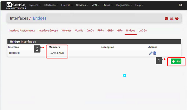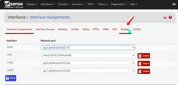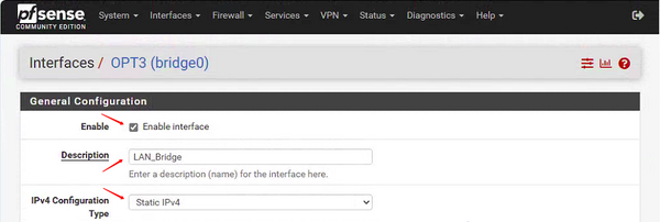 • Interfaces Assignments add BRIDGE0 and change OPT3 to LAN_bridge,select Static IPv4.